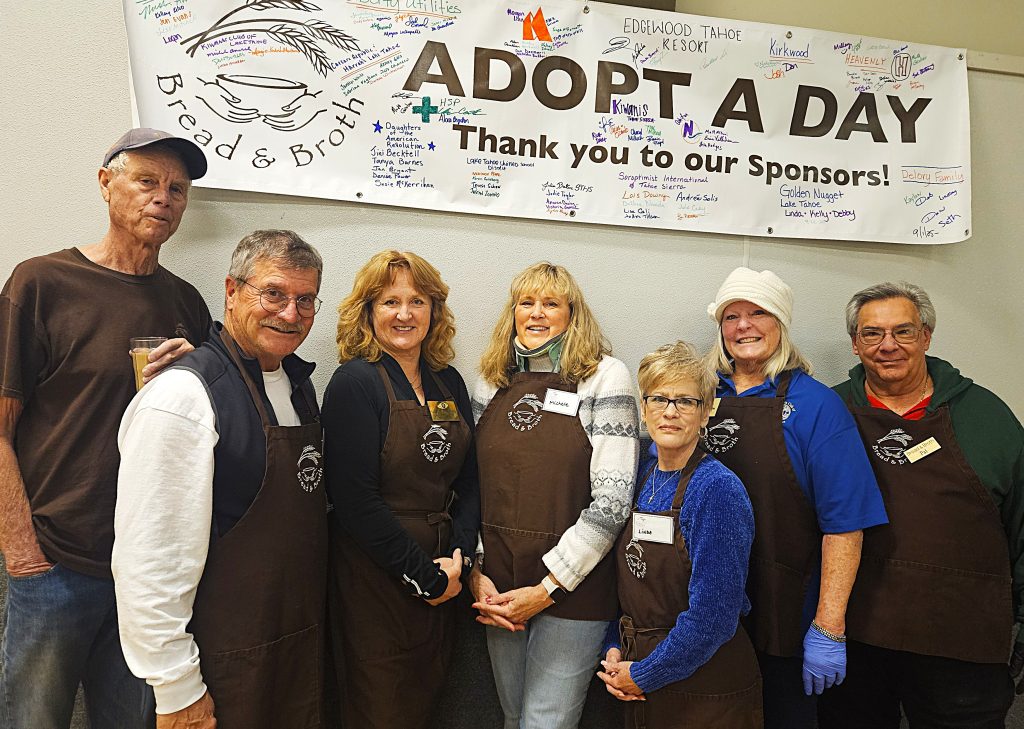 Bread & Broth is very grateful to the Kiwanis Club of Lake Tahoe for choosing Bread & Broth as one of their service projects. The club’s most recent AAD sponsorship took place on Monday February 16th. Representatives from the organization included Linda Amaral, Michele Amaral, Don Borges, Margie Kovarik-Maxhimer, and Velma Schnoll (the club’s president). Additional Kiwanis Club members volunteering at the meal were Bob Harms, Pat Frega, and Christy Slocum, who in addition to being Kiwanis Club members, are also regular Bread & Broth Monday Meal volunteers.