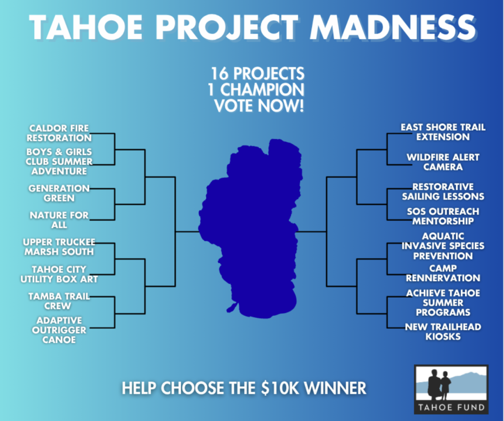 Tahoe Project Madness is a play on their annual community-voted March Madness, essentially taking 16 projects and using a bracket system to narrow down the projects based on what the community wants. Whichever project wins by community vote gets a $10,000 boost from Tahoe Fund.