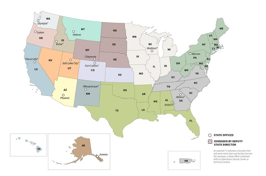 An asterisk (*) indicates a location that will serve more than one facility function (for example, a State Office combined with an Operations Service Center or technical center).Provided / U.S Department of Agriculture