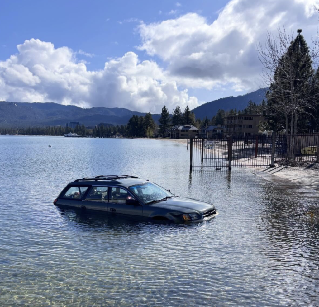 SOUTH LAKE TAHOE, Calif. – On Monday morning, April 27, South Lake Tahoe police and fire crews responded to an incident that left a Subaru Hatchback in the shallows of Lake Tahoe near Timber Cove Beach.